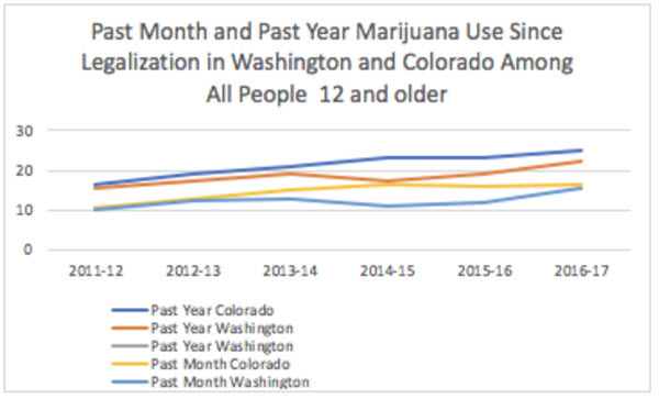 - Past month use of marijuana is noticeably greater in states that have legalized among those 12+ by 7.6% (legal: 16%; non: 8.5%), 12-17 by 2.8% (9.1%; 6.3%), and 18+ by 8.7% (17.4%; 8.7%).